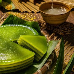 Một món bánh truyền thống rất được yêu thích là Bánh da lợn. Bánh nổi bật với nhiều lớp mềm dẻo xen kẽ giữa đậu xanh và lá dứa.