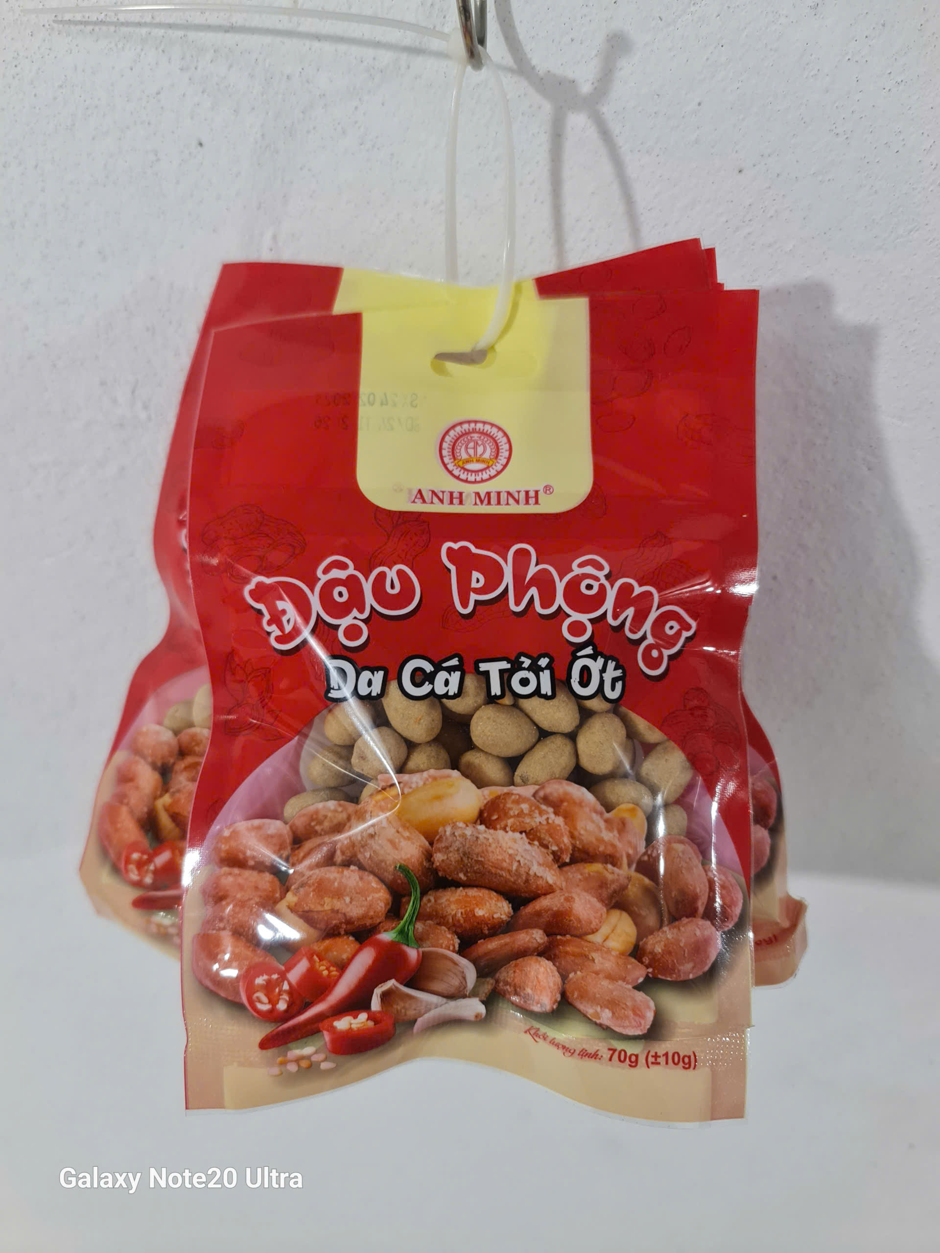 Đậu phộng da cá tỏi ớt đóng gói túi có lỗ xiên dây, khối lượng tịnh 65g
