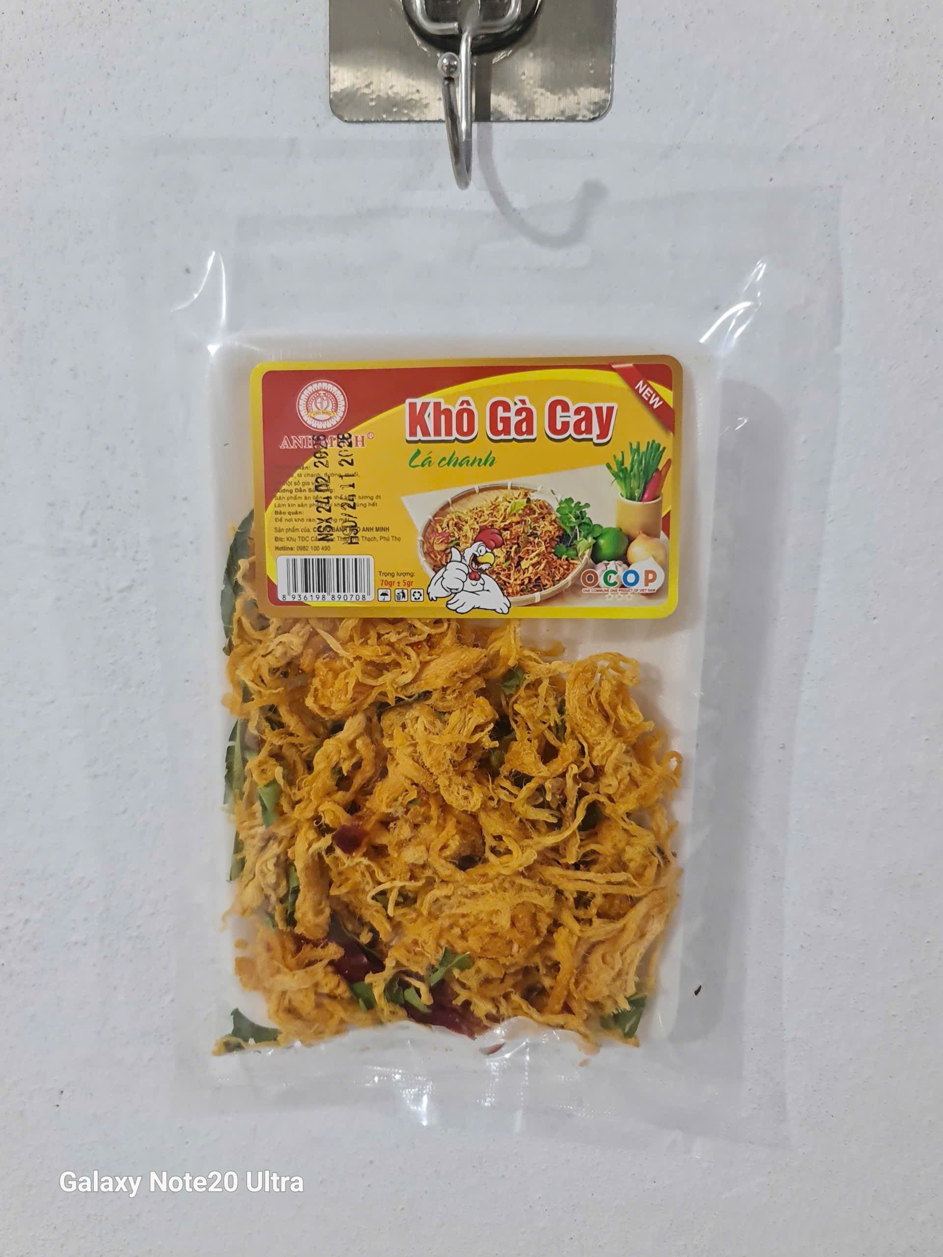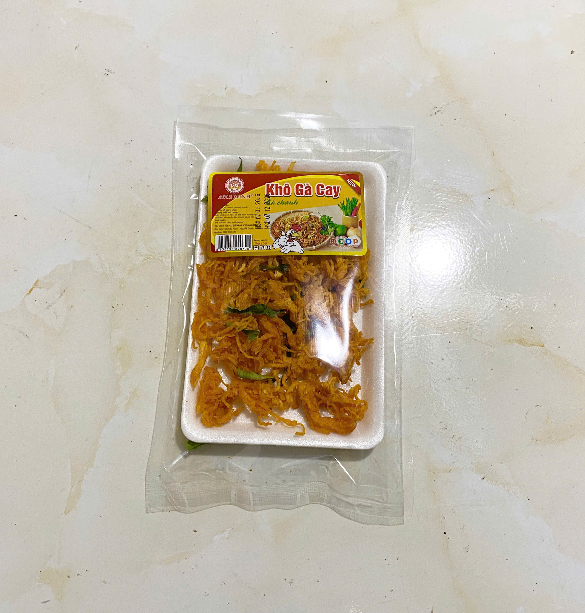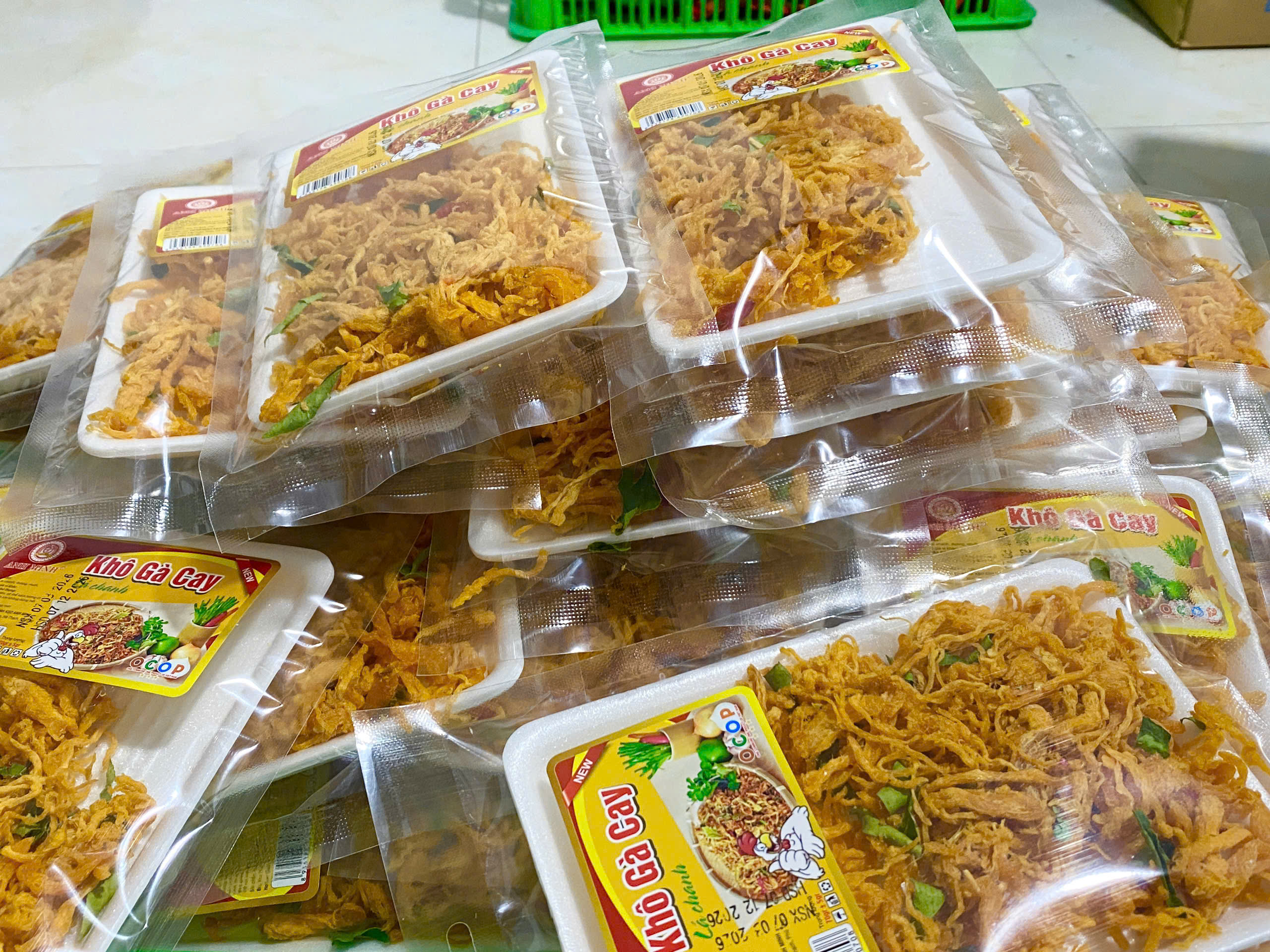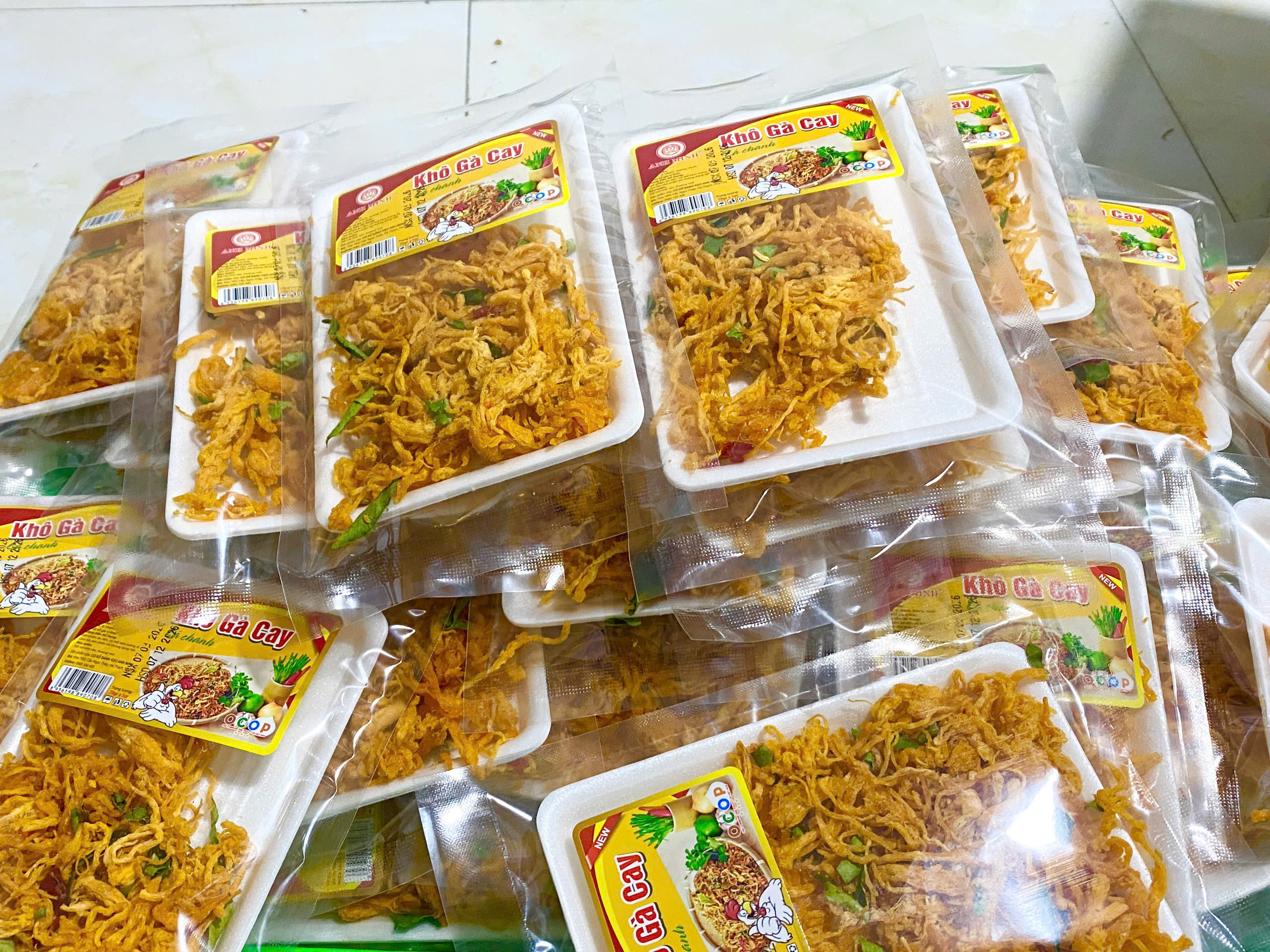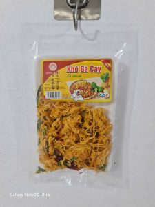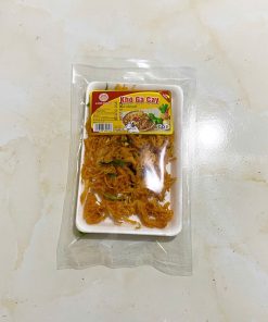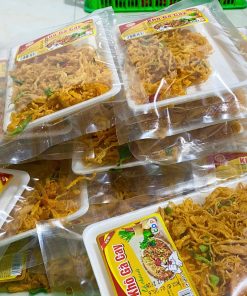 Thịt gà sấy lá chanh đóng gói vào túi có khay đựng, khối lượng tịnh 65g